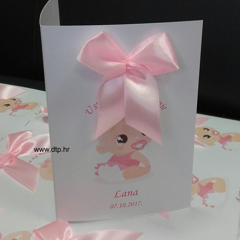 Može se koristiti kao pozivnica ili zahvalnica. Boja papira bijela ili šampanj. Na fogografiji je bijela boja. Tekst se na prednjoj strani može mjenjati kao i boja mašnice. Preklopni papir. Minimalna narudžba 10 komada