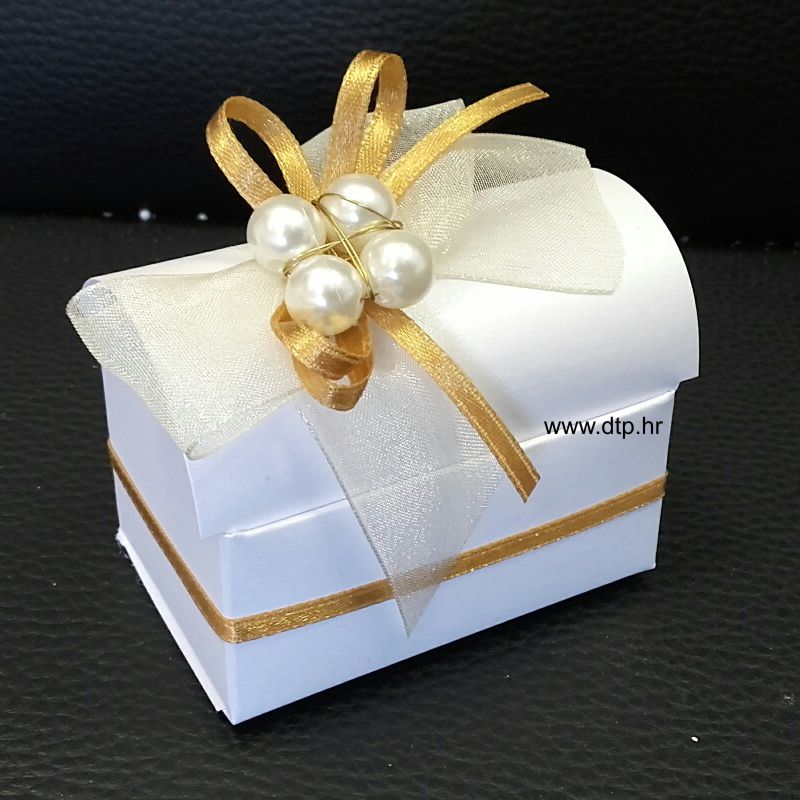 Pozivnica u obliku škrinjice. Na slici je prikazana bijela škrinjica sašampanj i zlatnom trakom.