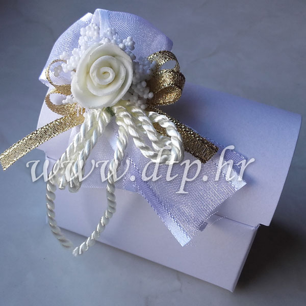 Ukrašena je s bijelom organdi trakom s bijelim rubom, sjajnom zlatnom trakom, šampanj šoagicom, šampanj ružicom s bijelim bobicama.