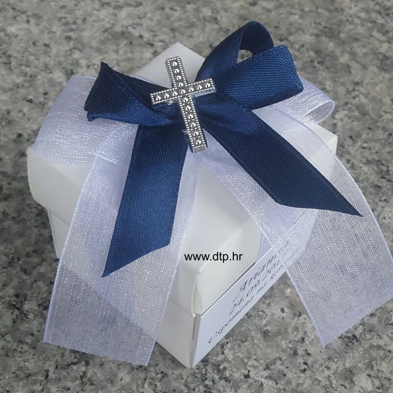 Prljavo bijela kutijica, izrađene od papira. U cijenu je uračunata dekoracija kao na slici te tisak na ceduljicu i 3 konfet bombona koja se nalaze unutar kutijice .