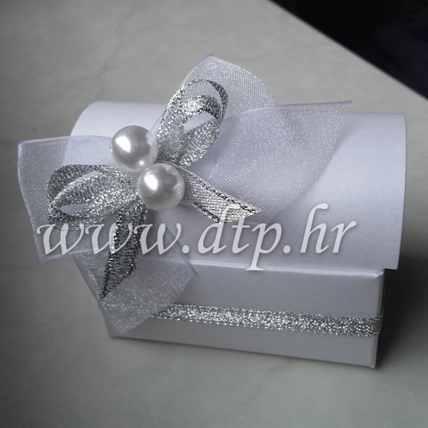 Boje papira može biti bijela ili šampanj. Na slici je prikazan bijeli. Ovaj proizvod može biti i konfeta (poklon za goste) sa tri bonbončića i ceduljicom s tiskom (cijena je ista). Ako se koristi kao pozivnica tada se u samoj škrinjici nalazi papir s tekstom (također uračunat u cijenu)