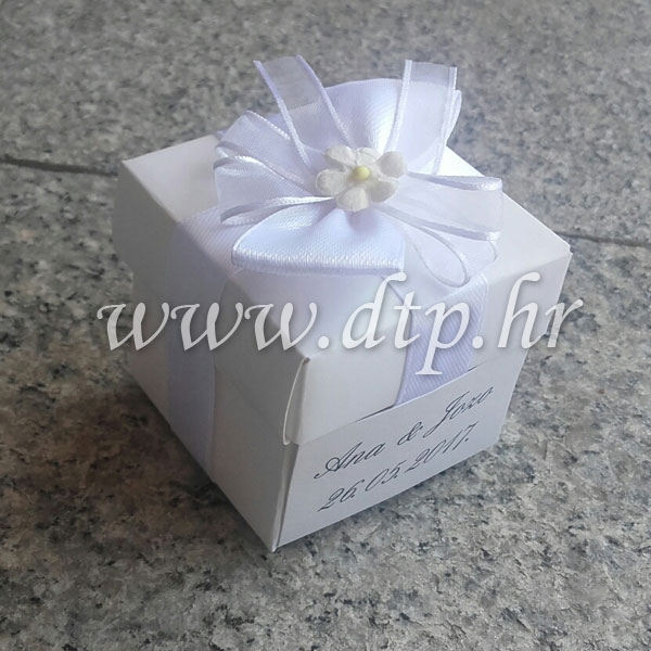 Prljavo bijela kutijica, izrađene od papira. U cijenu je uračunata dekoracija kao na slici te tisak na ceduljicu i 3 konfet bombona koja se nalaze unutar kutijice .