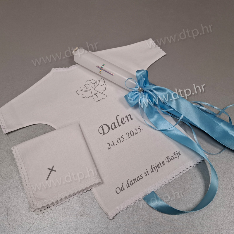 Komplet sadrži sljedeće: krsnu svijeću i košuljicu za krštenje i maramicu
