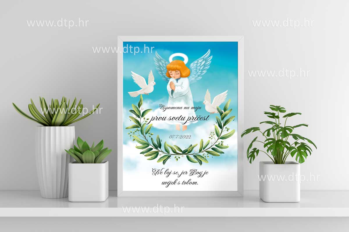 Plakat uspomena na prvu pričest anđeo. Moguće je naručiti sa ili bez okvira.